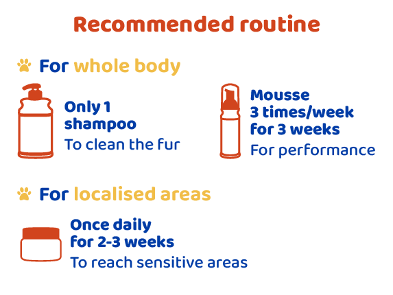 Use one pump for every 4 lbs. Double the dosage for long and/or thick fur. Wet with cool water from the neck down. First, gently massage shampoo onto the problem area. Repeat on entire body and leave on for 5-10 minutes before rinsing. Repeat if necessary. Wash hands after use. Use DOUXO®S3 PYO Mousse for a leave-on solution.